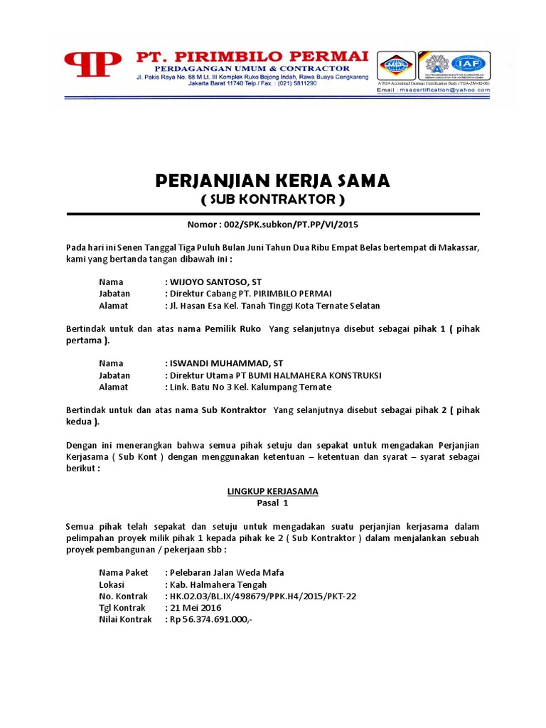 Contoh Surat Perjanjian Kerjasama Proyek - Contoh Surat Perjanjian Kerjasama Perusahaan - Content : Surat perjanjian pelaksanaan pekerjaan pemborongan.. Misalnya janji untuk pergi kerja bersama atau janji untuk nonton bola pada malam hari bahkan berjanji untuk setia dengan pasangan. Siapa saja pastinya selalu melakukan kerjasama untuk semakin memperluas link ataupun sebagai bentuk kerjasama dalam hal pekerjaan. Surat perjanjian kerja sama penting untuk dibuat agar menghindari saat bekerja sama baik itu berupa kepemilikan sebuah bisnis atau pembagian hasil tidak terjadi cekcok. Perbedaan surat izin tempat usaha. Home » project » contoh surat perjanjian subkontraktor proyek.