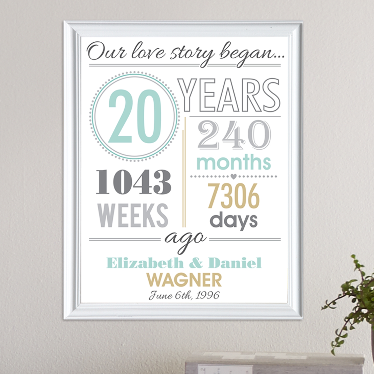 For a small but thoughtful 20th anniversary gift, choose this sweet little ceramic heart that lists the couple's names along with their wedding date. 20th wedding anniversary gifts ideas for husband: Personalized 20 year anniversary gift print makes a unique wedding anniversary gift. Home accessories picture frame vase mug tea set trip to china. Reflect on the commitment to a lifetime marriage that the two of you have made as you here are some 20th wedding anniversary ideas and symbols to help you choose the china or platinum gifts that are associated with the event.